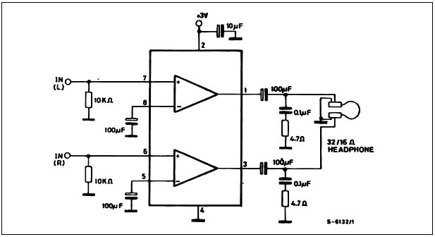 I had one issue with the design though, two 9V batteries, stuffed into an Altoids tin, took up a lot of space, and left very little room for the actual circuit board. I searched digikey, looking for an amplifier that would allow me to use just a single battery, and provide at least 1/2W per audio channel. After a bit of searching, I found the TDA2822 and just used the typical application circuit in the datasheet: